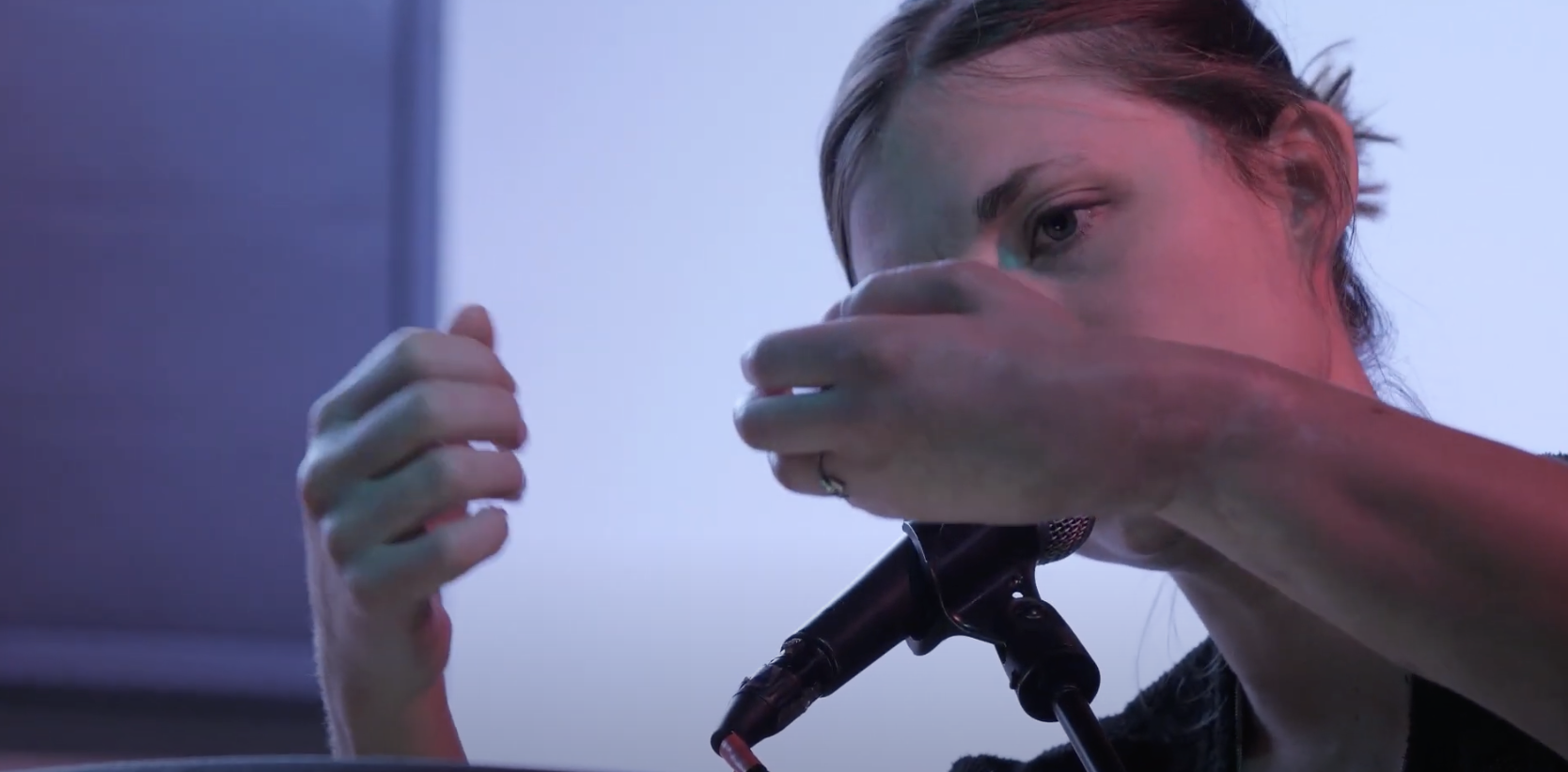 photo by Maya Smira, image description: Project of a video with blue-sky background and two hands interacting against, with Molly performing in front of it and only face and vocal mic against the video are seen.